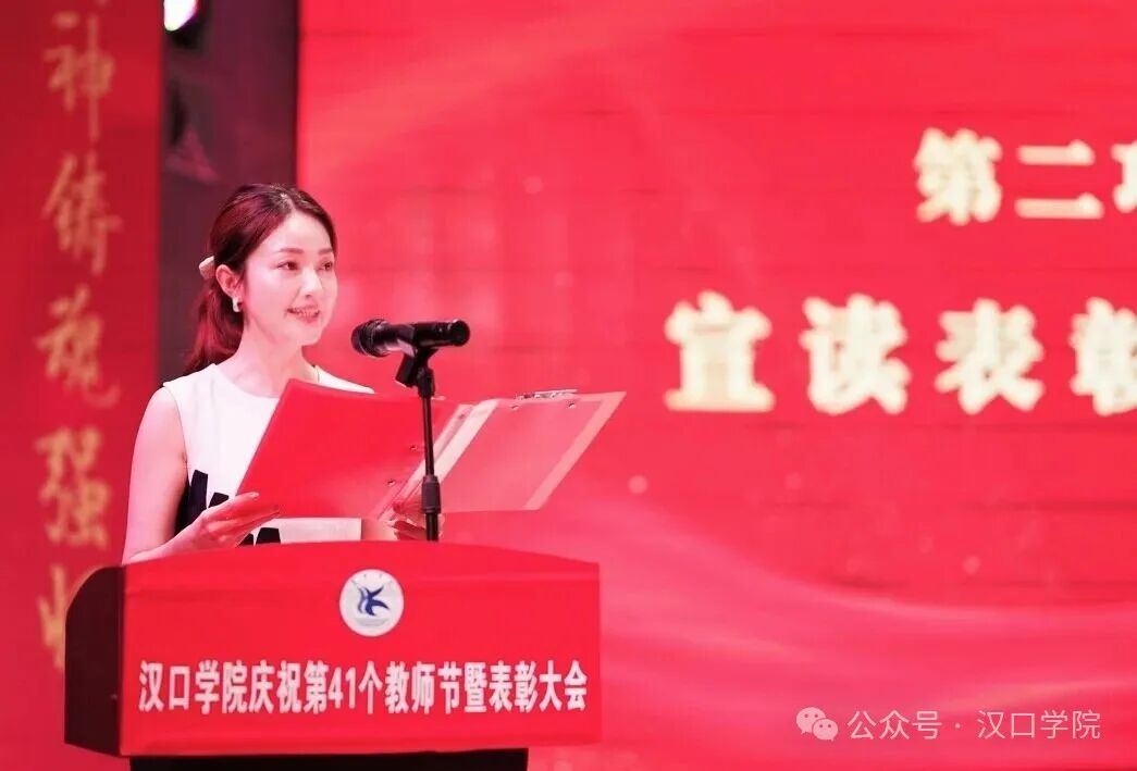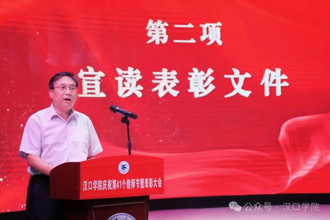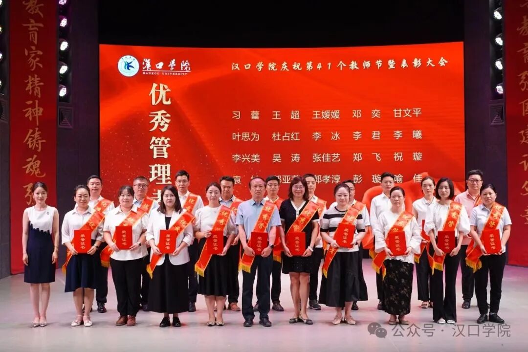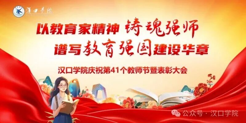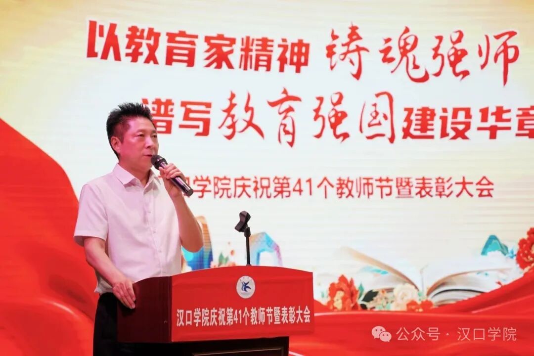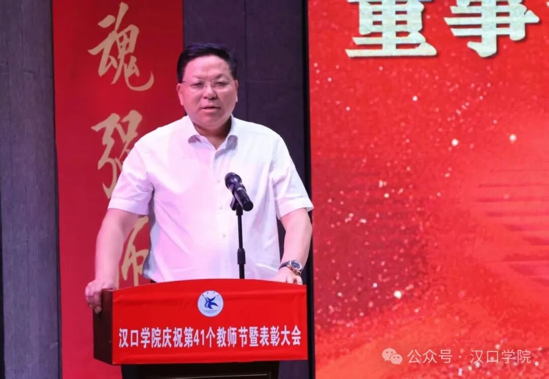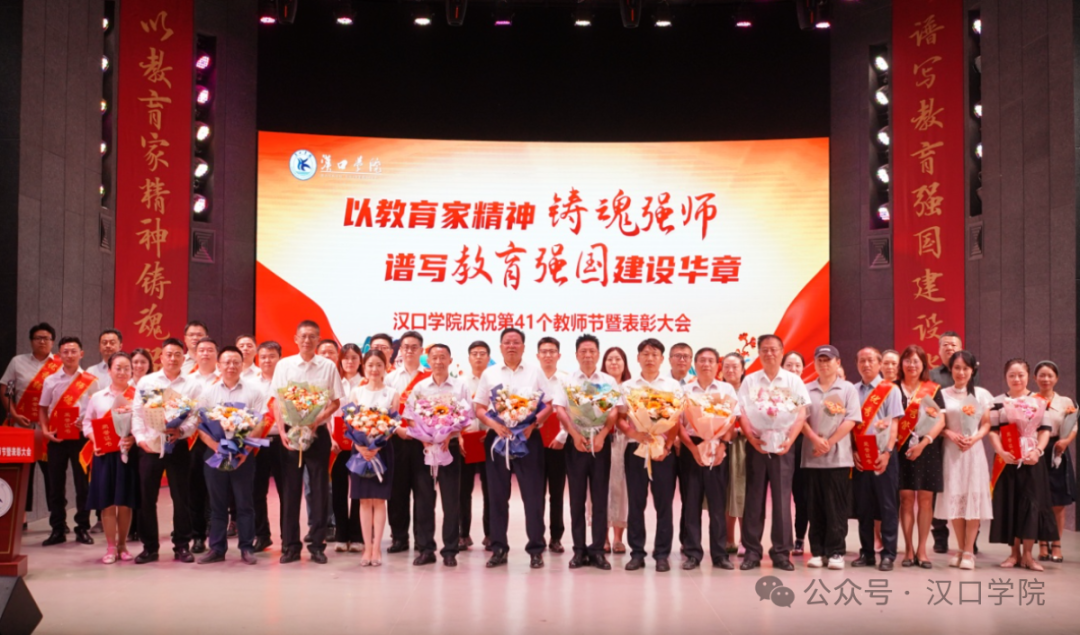 金秋九月,丹桂飘香;桃李芬芳,礼赞师者。9 月 9 日,汉口学院庆祝第41个教师节暨表彰大会在音乐厅隆重举办,本次大会主题是“以教育家精神铸魂强师,谱写教育强国建设华章”。 董事长、校长罗爱平教授,党委书记张宁以及全体校领导出席会议,全体教师参加会议。
