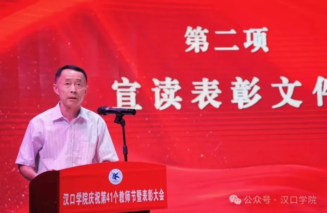 ▲常务副校长吴怀宇宣读《关于表彰2024-2025学年度“师德标兵”“汉院好老师”“优秀管理者”和“优秀教育工作者”的决定》